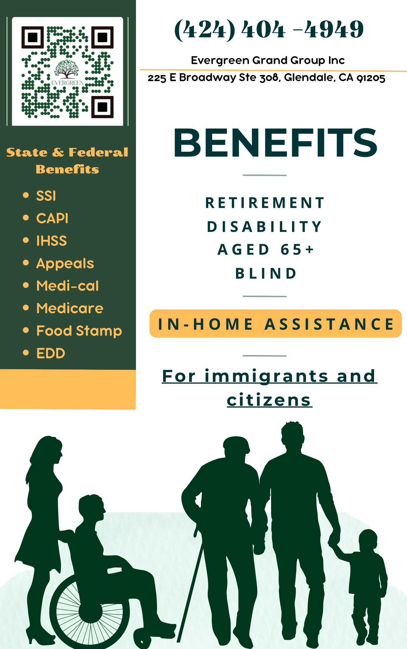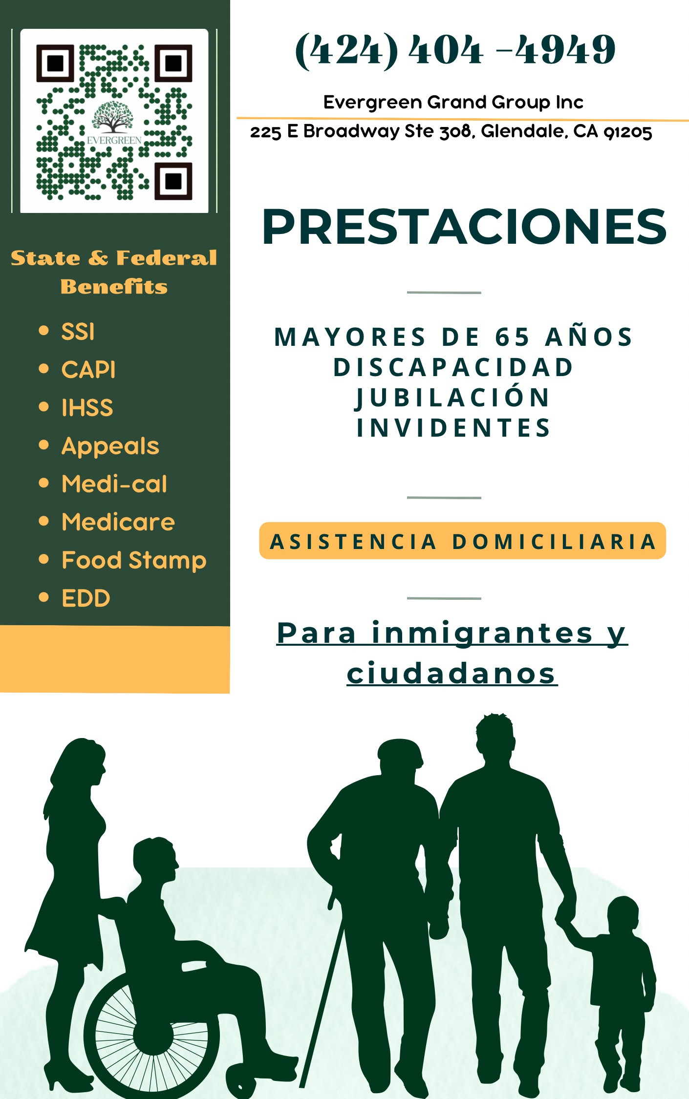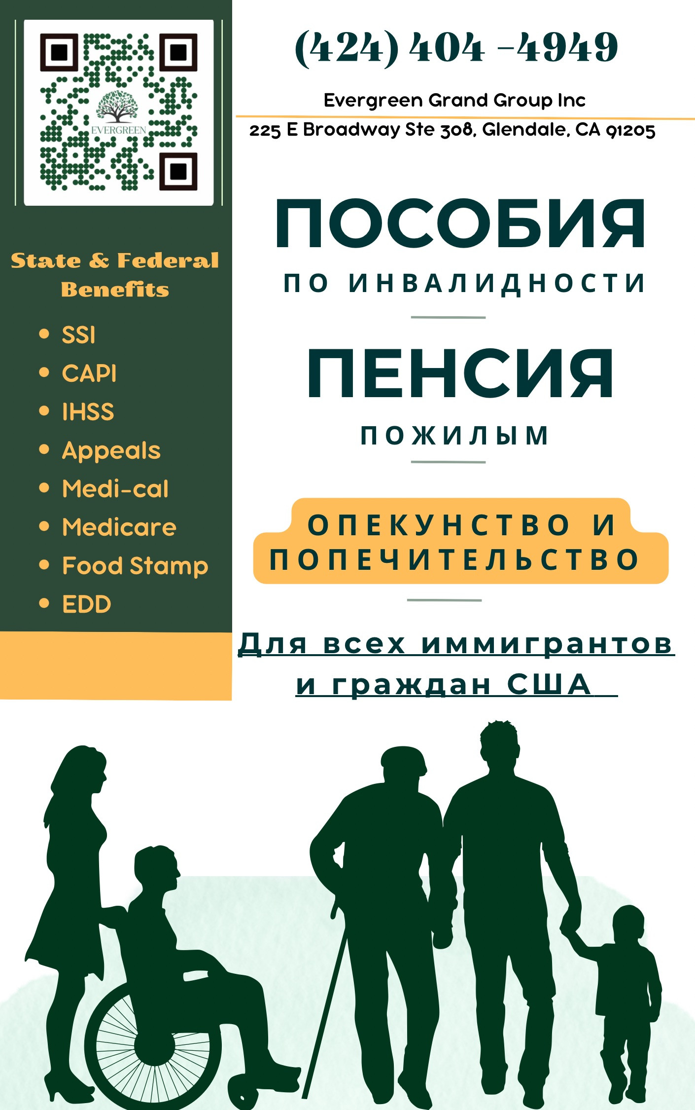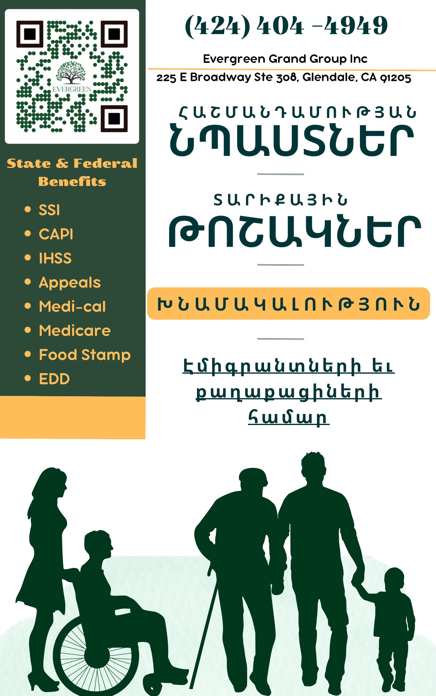 Տարիքային կենսաթոշակ եւ հաշմանդամության նպաստներ։ Բոլոր ներգաղթյալների և ԱՄՆ քաղաքացիների համար: հաշմանդամության նպաստներ, կենսաթոշակներ (65+ տարեկան), CAPI ( Green Card-ով իմմիգրանտներին հովանավորով և առանց հովանավորի), SSA/SSI, Medi-cal, Medicare, Food Stamp, Խնամակալություն (IHSS), կառաջարկենք պետական բոլոր հնարավոր նպաստնէրն օրենքի շրջանակներում։ Խորհրդատվությունն անվճար է! Для всех иммигрантов и граждан США! пособие по инвалидности, пенсии 65+ лет CAPI (иммигранты с Green Card-ой со спонсором и без спонсора), SSA/SSI, Medi-cal, Medicare, Food Stamp, опекунство и попечительство (IHSS), государственные пособия, в рамках закона. Консультация бесплатная! Get disability benefits, pensions (65+ years old) CAPI (Green Card holders with and without a sponsor), SSA/SSI, Medi-cal, Medicare, Food Stamp, In-home Supportive Services (IHSS), we will offer all possible governmental benefits, within the frame of the law. Evergreen Grand Group Inc (424)404-4949 225 E Broadway Suite 308 Glendale, CA 91205