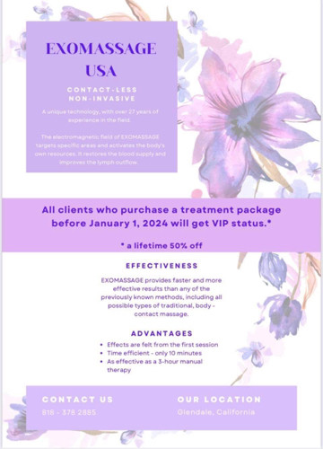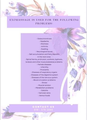 CONTACT -LESS NON-INVASIVE A unique teohnology, with over 27 years of experience in the field. The electromagnetic field of EXOMASSAGE targets specific areas and activates the body's own resources. It restores the blood supply and improves the lymph outflow. - Osteochondrosis - Headache - Dizziness - Arthritis - Swelling - Neurological issues - Salt accumulation and fatty deposits in the neck area - Spinal hernia, protrusion, scoliosis, kyphosis, lordosis and other musculoskeletal problems - Female diseases - Infertility - Prostatitis - Diseases of respiratory organs - Diseases of the digestive system - Diseases of the nervous system - Blood circulation problems - Stress - Muscle tension - Metabolism problems - Cellulite - Varicose veins - Hemorrhoids